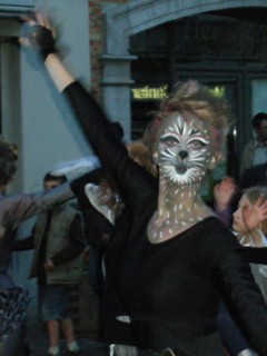 その後ろを、劇団四季のキャッツみたいなネコメイクの人たちが踊りながらついて行って…