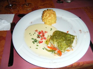 スズキの香草焼きクリームソース、マッシュポテト表面焼いたの添えて