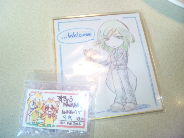 そうそう、KaiさんからアイクのWelcome色紙とすきゅら協同組合のバッヂを貰った!!