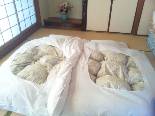 ベッドが二つある一部屋と、10畳の畳部屋と、リビングとキッチン。
