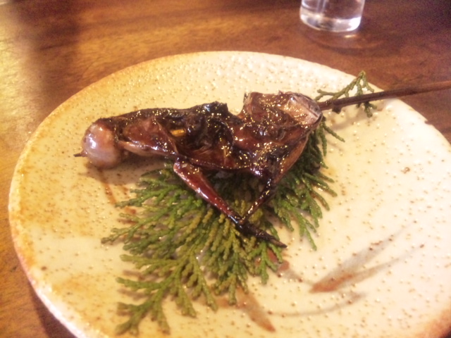 駅から稲荷までの間にすずめとかうずらの丸焼きが売っている。